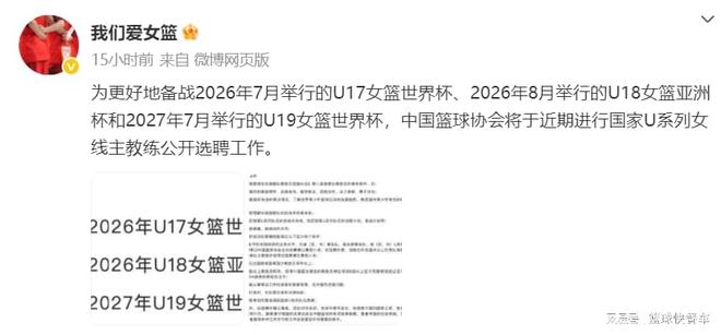 在接下来一两年内,U系列青年队有不少国家队大赛,像2026年7月份开打的U17世青赛,同年还有U18亚青赛。而2027年7月份,则还有U19世青赛。目前,这三项赛事的主教练人选还没有确定,和以往篮协直接任命不同,这一次,中国篮协也开窍了,他们已经正式宣布,这一次女篮主帅人选,将通过公开选拔,择优录取。换句话说,只要有能力,你就可以来尝试。
