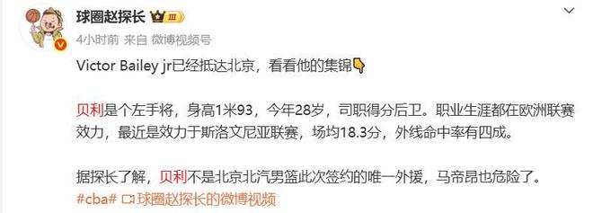 许指导没有说太多,但北京男篮接下来的新外援是谁,赛前已经有不少球迷们都知道了,据媒体人赵探长的爆料,北京近期已经签下了小外援维克托·贝利,贝利身高193cm,上赛季效力于德甲联赛开姆尼茨队,场均得到15.2分2.6篮板1.9助攻,本赛季效力斯洛文尼亚联赛效力,场均能得到18.3分,三分命中率有4成,并且贝利也不是北京队的唯一新援。