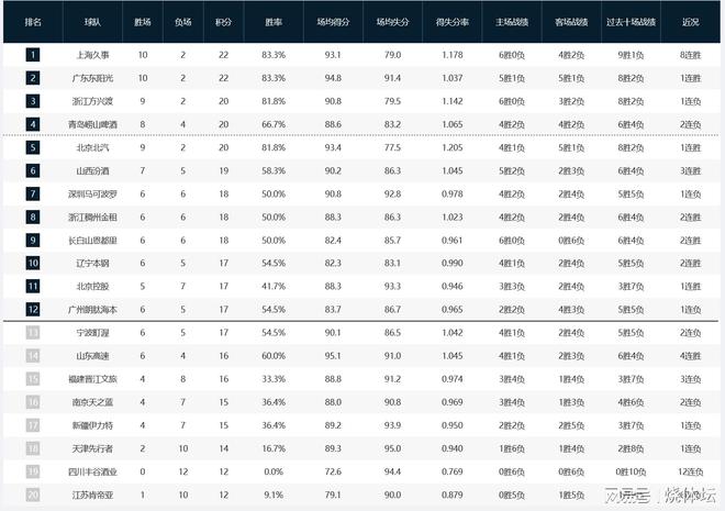 至此,浙江男篮客场告捷取得2连胜,总成绩提升为6胜6负胜率达到50%,最新排名攀升到第八。广州男篮3连胜被终结了,这场比赛输得有点惨,总成绩改写为6胜5负排名第12位。