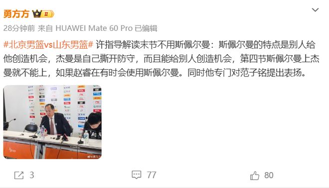 勇方方则表示:有俩事我不是很理解,第四节连续丢篮板球的时候,为啥上了套小阵容?全场最准三分6中4的斯佩尔曼为啥末节一分钟不上呢?
