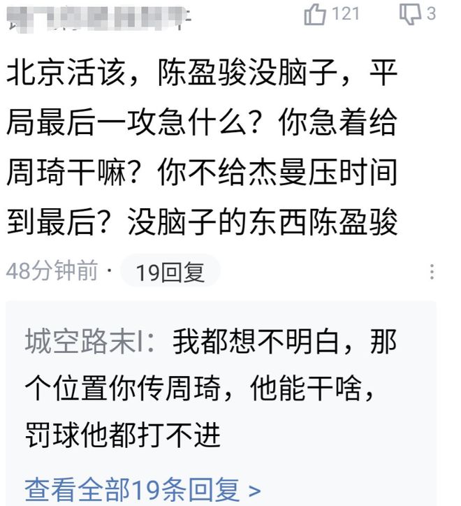 这一球至关重要,没有克里斯,就没有珀赛尔的最后绝杀,换句话来说,北京主要就是输在了第四节最后关头陈盈骏和周琦的连线失误上,赛后有不少球迷都将北京输球的大锅都扣给了陈盈骏和周琦,情绪激动的球迷直接怒斥:北京活该,陈盈骏没脑子,平局最后一攻急什么?着急给周琦干嘛?