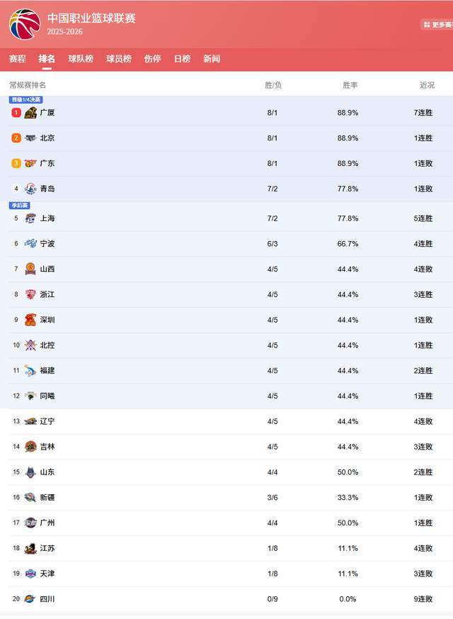 CBA常规赛第9轮战罢,联盟格局迎来重大变化。所有连胜球队均告终结,榜首易主,3大豪强并驾齐驱,中游球队激烈厮杀,2大黑马高歌猛进,而部分队伍则陷入困境,辽宁跌出前12,山东倒数第6。