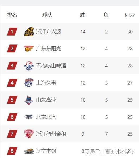 11冠王广东队,在上一轮惨败给上海队以后,这一轮比赛他们在主场继续输球,面对整体实力一般的北控队,广东队在末节最后时刻惨遭对手的读秒绝杀,最终以1分之差惜败。输掉这一战后,广东队的战绩变成12胜4负,不过,由于先赛一轮的缘故。广东队这一战输掉比赛后,他们的排名不但没有下滑,反而上升一位,从积分榜第三,直接上升至第2名。而积分榜第三名则属于青岛队,他们的战绩也是12胜4负。