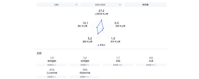 16次出场后,焦海龙场均可为球队贡献10.1分5.2篮板1助攻,投篮命中率62.1%,三分命中率41.4%。这两项命中率数据,均创下了他职业生涯出场次数超过2场的赛季新高。