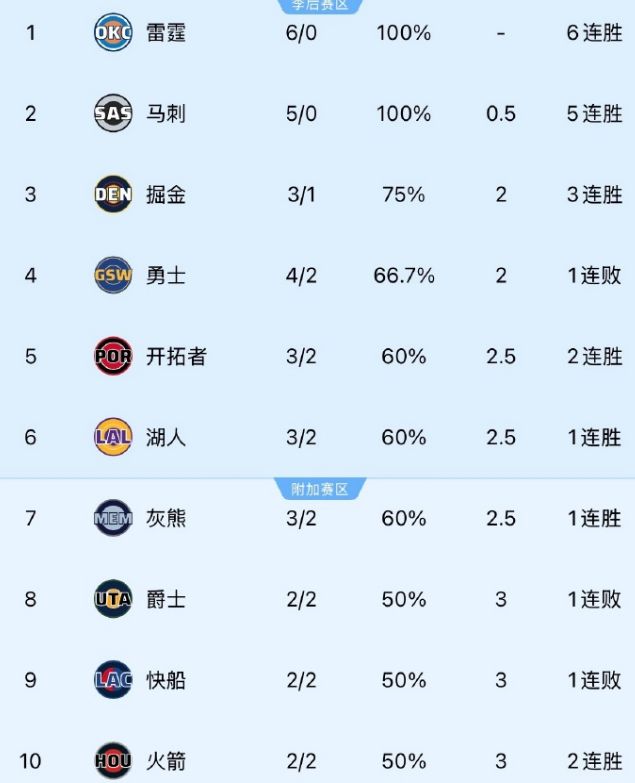 简单谈谈雷霆的情况,目前为止以6胜0负高居西部&联盟榜首位置,他们在防守效率值上以103.6傲视群雄,马刺则以104.8紧随其后。马刺本赛季真的是崛起了,同样至今未尝败绩(5胜0负),且净效率值以+15.6遥遥领先所有球队。