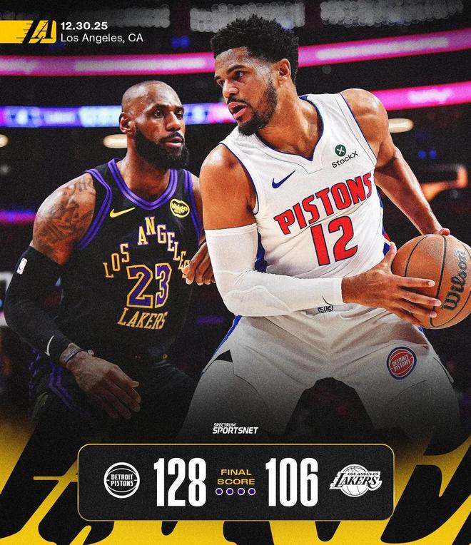 2025年的最后一天,勒布朗·詹姆斯的41岁生日夜,湖人终究没能用一场胜利来为詹姆斯庆生,也没能为这一年收个好尾,他们在主场以106比128惨败给活塞22分,这场惨痛的失利不仅让整个夜晚倍感苦涩,也让球迷对2026年湖人的表现感到担忧。
