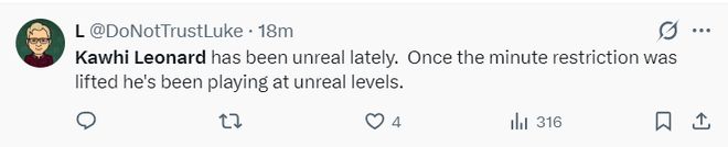 美球迷:自从莱昂纳德解除了登场时间限制后,他的表现就超乎寻常了。