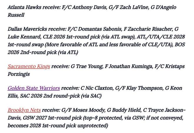 独行侠得到:小萨博尼斯+里萨谢+肯纳德+26年骑士首轮签(来自老鹰)+28年首轮互换+26年二轮签;