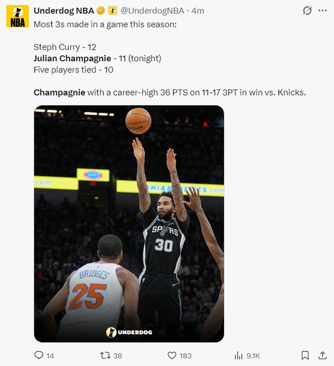 北京时间1月1日,马刺134-132险胜尼克斯结束二连败。这场比赛马刺一度落后尼克斯19分,但在末节实现了大逆转,进入最后8分钟马刺都还落后11分之多,没想到这时候一位拿着300万的投手尚帕尼突然三分之神附体,他不断命中三分把比赛拉入均势,最终马刺完成了大逆转。