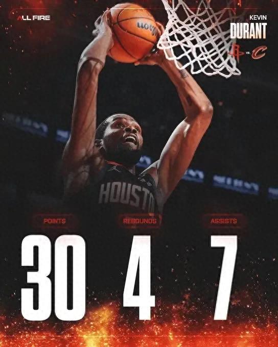 火箭主场以117-100轻松击败骑士,取得两连胜。在缺少核心中锋申京的情况下,火箭竟然打出更为流畅和高效的进攻。申京因左小腿紧绷缺席比赛,取而代之的是亚当斯首发,但火箭的进攻却显得随心所欲,特别是杜兰特的发挥,他好像比和申京搭档时更轻松。杜兰特仅出战不到29分钟,就高效砍下30分外加4篮板7助攻。他的投篮命中率高达64.7%(17投11中),三分球4投2中,罚球7投6中。