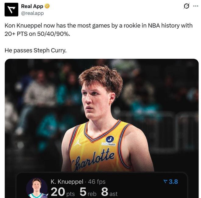 要知道新赛季场次还未过半,克努佩尔就已经超过库里,按照目前的势头来看,他势必大幅刷新库里保持的这一项NBA历史神纪录,也将威胁库里手中保持的数项有关新秀的三分投射纪录。