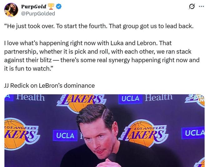 雷迪克赛后称赞了詹姆斯这样的表现:“勒布朗接管了比赛,末节一开始他就率队重夺优势,我真得太爱东契奇和勒布朗现在的化学反应了,他们之间正产生真正的协同效应,看着真是赏心悦目。”