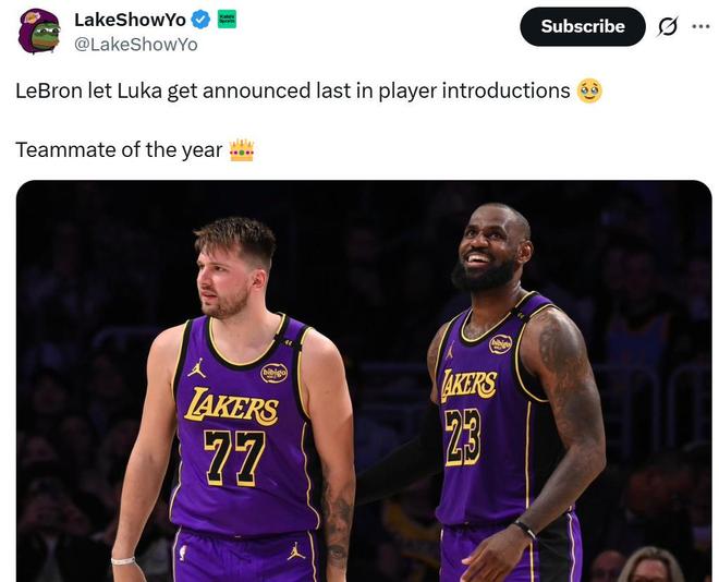 不仅是赛后公开称赞东契奇是球队核心,根据美媒LakeShowYo报道,在赛前介绍球员入场时,詹姆斯也让东契奇最后一个压轴出场。