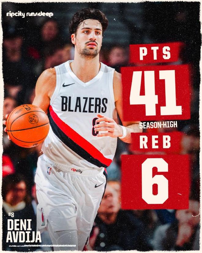 力压KD,阿夫迪亚24中13砍赛季新高41分&开拓者生涯首次40+
