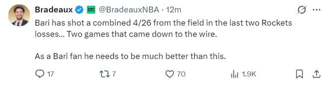 火箭队记Bradeaux写道:火箭队近期接连输给西部排名15、14、13、12、11、9的球队,目前火箭战绩22胜12负,火箭净胜分联盟第二,这真是一支有趣的球队。