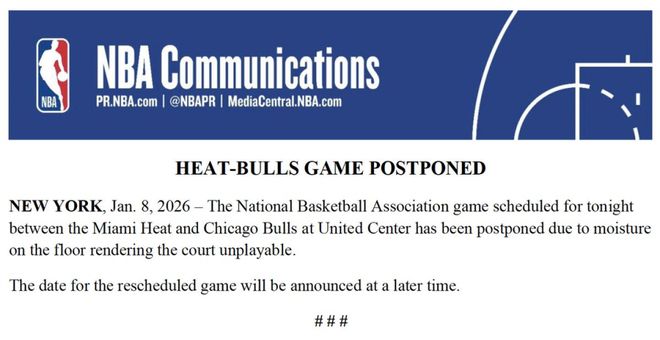 北京时间1月9日,NBA官方宣布,热火与公牛在芝加哥联合中心球馆的比赛,因场地出现积水问题最终决定延期进行,重赛日期将另行公布。