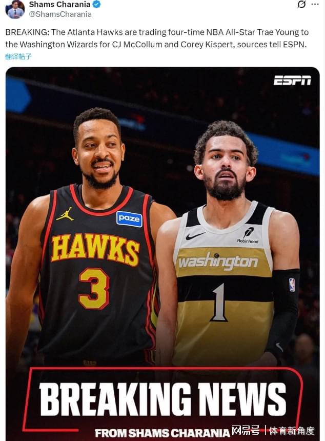 要说交易这事儿,老鹰队那可真是“风风火火闯九州”啊!前天才刚和“杨市长”在办公室门口“谈心”,探讨离队大计呢,今天就像变戏法似的,“嗖”地一下就把人给送走啦!据“小道消息达人”Shams爆料,老鹰和之前眉来眼去好久的奇才队,正式敲定了一笔1换2的大买卖。咱这位四届全明星“杨市长”,这就带着他的天赋,一路“狂飙”到首都华盛顿啦,而老鹰则换来了CJ和基斯珀特这俩“宝贝”。
