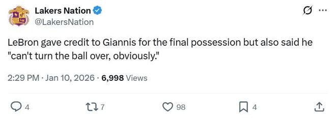 赛后接受采访,詹姆斯对那一次关键的失误公开道歉:“对我来说,那个回合实在是太糟糕了,我在关键时刻失误了,字母哥从后面把球拍掉,那是个精彩的防守,我显然不能在那种时刻犯错。”