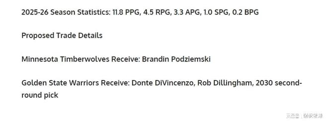 距离本赛季交易截止日,现在只有不到一个月时间了,所以各类流言可谓满天飞,更何况勇士这种流量大队。因此媒体FW也来凑热闹,支招勇士做1换3交易,送走替补布兰丁-波杰姆斯基,换回后卫唐特-迪文琴佐,方案涉及的其他部分,是前乐透秀迪林厄姆再加上一个来自2030年次轮签当添头。