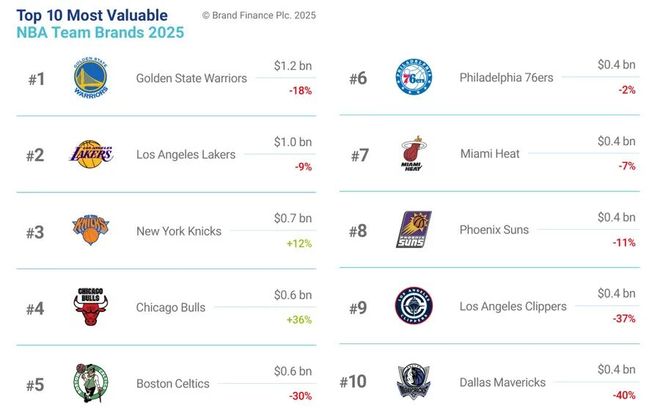 2025美国NBA品牌价值30强球队榜单,金州勇士队、洛杉矶湖人队、纽约尼克斯队列前三