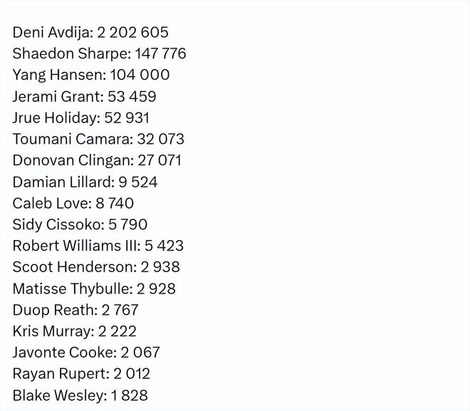 有媒体统计了开拓者球员在球迷投票环节的得票情况。阿夫迪亚2202605票断层领先全队,开拓者得票第二多的球员是谢登-夏普,他得到147776票,而杨瀚森得到104000票,位居第三。格兰特和霍勒迪分列第四和第五。以下是所有人的具体票数——