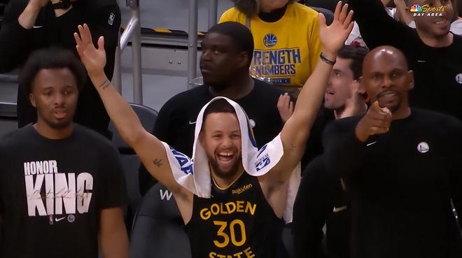 末节仅3分钟场下狂挥毛巾!库里双手举天+大笑露齿科尔治军有方