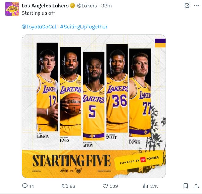 湖人:东契奇、斯玛特、拉拉维亚、詹姆斯、艾顿;