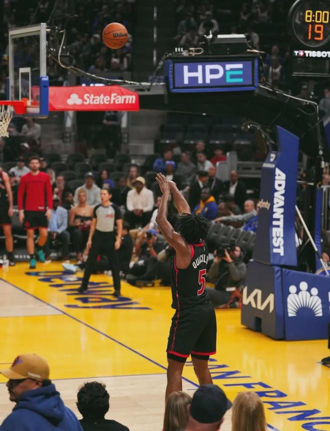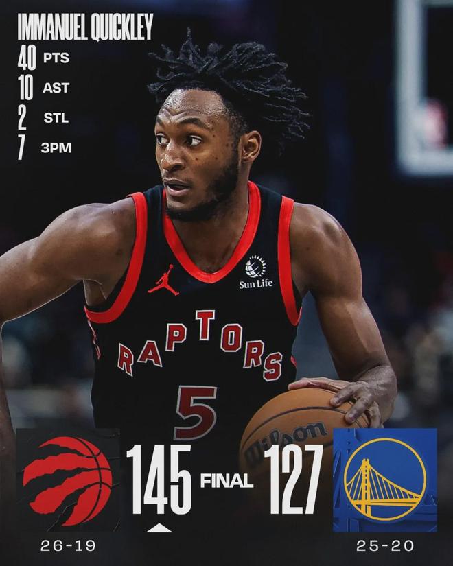 猛龙客场145-127大胜勇士,猛龙后卫奎克利爆发:投篮13中11,三分8中7,罚球11中11,狂轰40分2篮板10助攻2抢断,得分创生涯新高。13次出手砍下40+,奎克利是史上第三个做到的球员,前两个是奥尼尔和罗纳多·布莱克曼。
