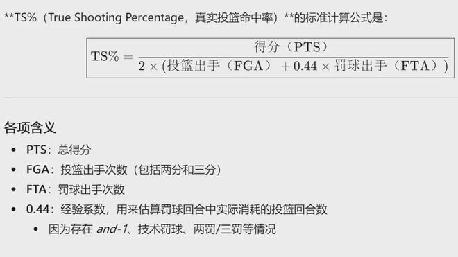 此外,奎克利本场真实命中率112.1%,超越迈尔斯-特纳(40分,真实命中率110.6%)和克莱-汤普森(44分,真实命中率110%),成为NBA历史上最高效的40+!真实命中率是可以超过100%的,计算公式并不复杂,详情看图: