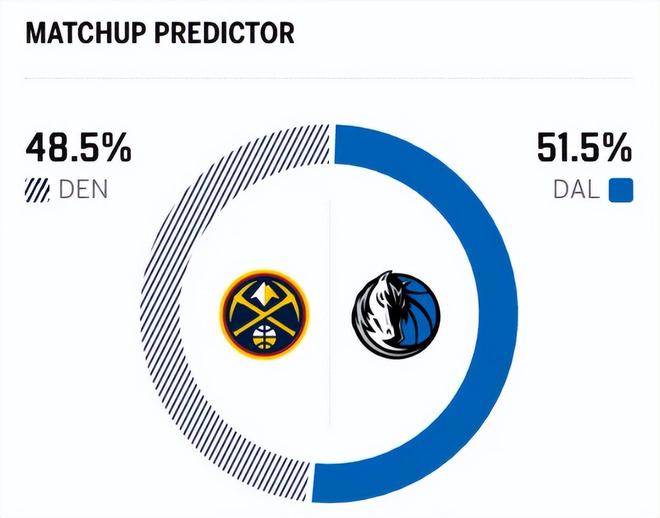 赛前,美媒ESPN对本场比赛进行了胜率预测,独行侠队胜率高达51.5% ,掘金胜率则仅有48.5% ,西部倒数竟然意外略占优势。