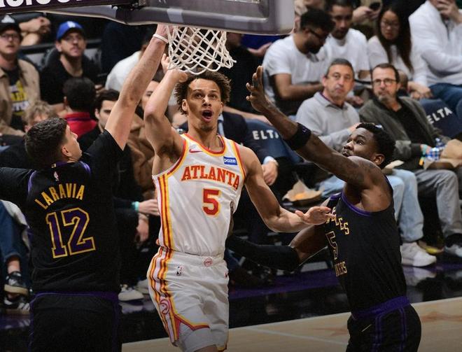 然后用特雷杨换来的麦科勒姆,已经被老鹰作为替补主要火力点,而他迅速融入成为高效第六人;中锋位置老鹰有奥孔古坐镇,防守端则依靠丹尼尔斯提供强度。整体来看,老鹰在失去杨之后,攻防两端的平衡性反而有所提升,近期取得三连胜,带着不俗的势头来到洛杉矶。本赛季没有特雷杨时,老鹰胜率超过6成以上。面对这样的一支攻防兼备的年轻球队,湖人却打出了极高的统治力。全场老鹰几乎没有招架之力。杰伦约翰逊作为球队基石,本场却被湖人彻底限制,全场17投仅5中,三分球7投1中,只得到可怜的13分。