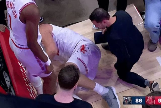 相比于比赛胜负,更关键的是比赛第四节,火箭中锋亚当斯在防守回合中突然失去重心倒地,随后双手捂住膝盖,迟迟无法起身,随后亚当斯被工作人员搀扶着走回更衣室。