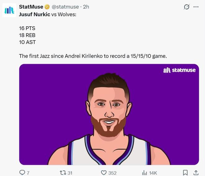 除了两大新星之外,爵士队之所以能够完成爆冷也与内线老将努尔基奇的爆发有关,本场努尔基奇11中7爆砍16分18板10助三双数据,外加1断1帽。