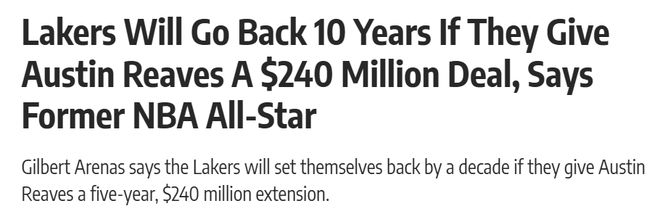 “也就是说,要是哪支球队真的铁了心想得到他,就必须付出远超筹码价值的代价,这正是我们(湖人)所期待的。因为一旦你(湖人)真的给他开出2.4亿美元的合同,球队很可能会因此倒退整整十年。”