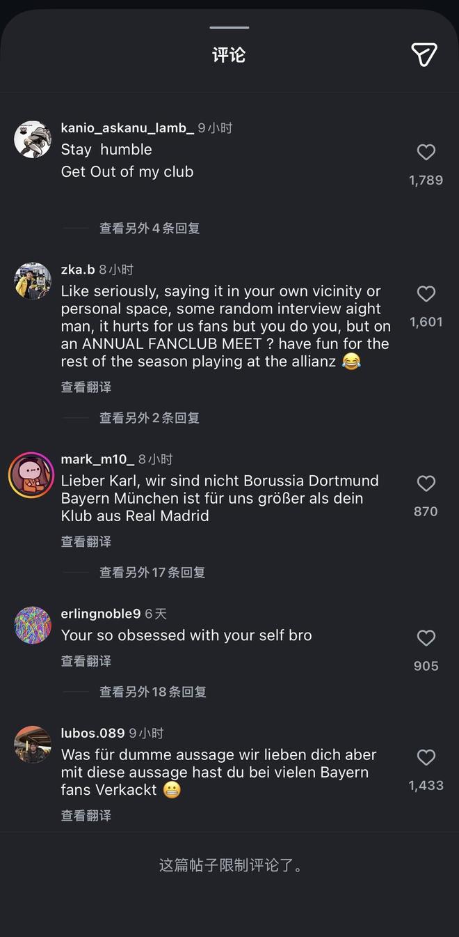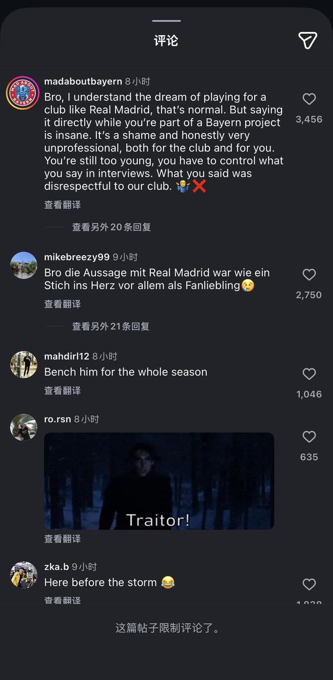 “兄弟,我理解你为皇马这样的俱乐部效力的梦想,这很正常。但身处拜仁时直接说出来就太疯狂了。这很遗憾,说实话非常不职业,对俱乐部和你自己都是如此。你还太年轻,必须控制自己在采访中的言论。你的发言是对俱乐部的不尊重。‍♂️❌️”