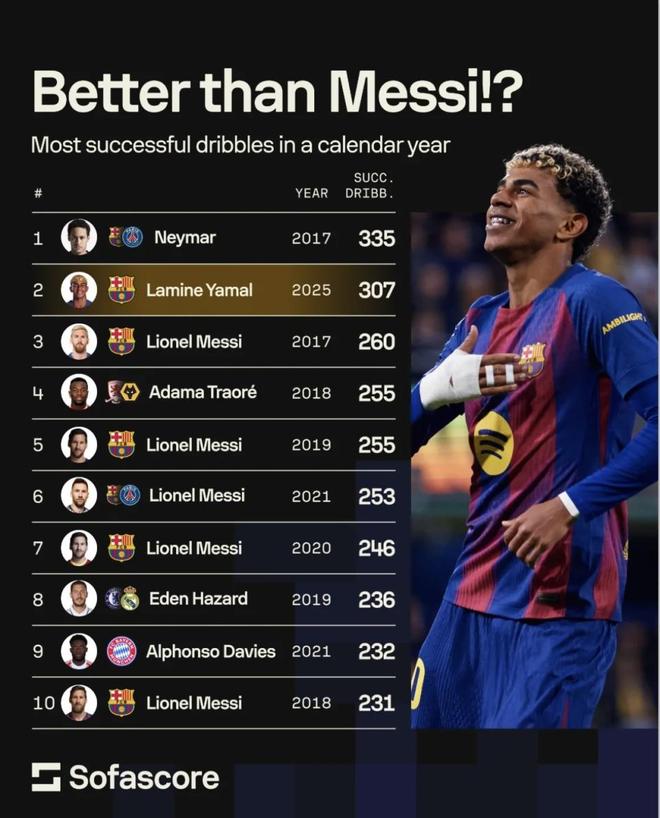 放到亚马尔身上,2025年这一条307次非常夸张——不仅直接压过梅西在榜单上的任何一年(最高260),还几乎追到内马尔2017年的335。问题在于,未来想“超过梅西”,关键不是再来一次300+,而是能不能连续很多年都保持在250+附近。随着年龄增长、位置和任务变化(更多组织、更多终结、被重点盯防更狠),过人次数很容易从“高频硬解”变成“更省着用”。所以更现实的预测是:亚马尔很有机会在单自然年过人次数上多次超过梅西,甚至冲击榜单第1;但要在“长期反复上榜、持续多年高产”这一点上真正压过梅西,难度更大,得看健康、出勤和角色能否长期稳定。