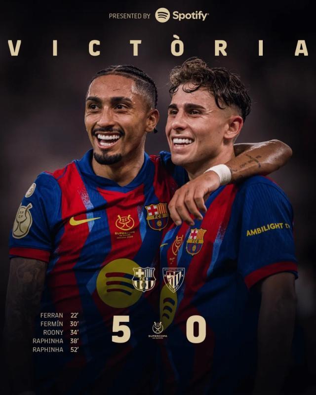 西超杯半决赛,巴萨对阵毕尔巴鄂竞技。费兰首开纪录,费尔明和巴尔德吉助攻双响+破门,拉菲尼亚梅开二度,巴萨5-0大胜对手,顺利挺进决赛!