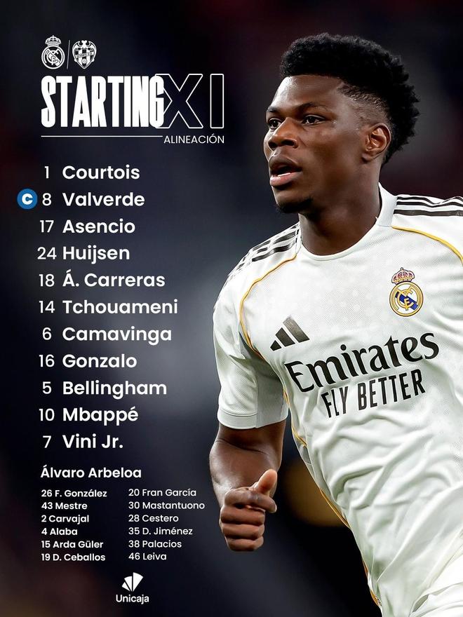 北京时间1月17日21:00,西甲第20轮继续进行,皇家马德里坐镇伯纳乌球场迎战莱万特,本场主裁判为米格尔-塞斯马,赛前双方首发出炉。