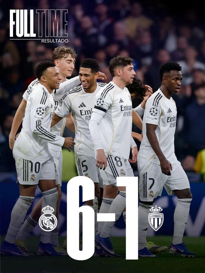 比赛结束,皇家马德里在欧冠主场大胜摩纳哥!