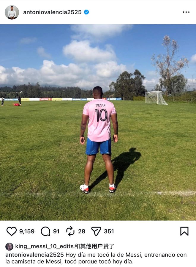 1月22日。有曼联名宿安东尼奥·瓦伦西亚近日发动态,晒出他穿迈阿密国际10号、梅西球衣的照片,场景是在训练。瓦伦西亚的配文是:终于轮到我了!今天轮到我了,轮到穿梅西的球衣训练了,轮到就是轮到,没商量。