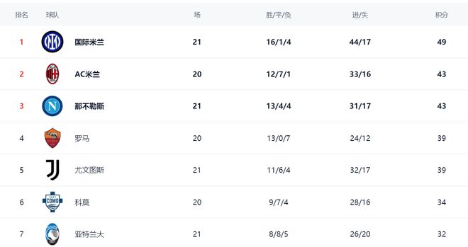 在积分榜上,国际米兰16胜1平4负,拿到49分,稳居榜首位置。显然,国际米兰就是夺冠最大热门,没有之一。AC米兰拿到43分,以6分的劣势排名第2。不过,AC米兰比国际米兰少赛一场。那不勒斯赢球之后,总积分也是达到43分,以净胜球的劣势排名第3。输球的尤文图斯依然是39分,排名第4。第5名的是罗马,同样是39分。科莫34分排名第6。亚特兰大只拿到32分,排名第7。