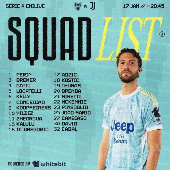 1月17日,尤文图斯公布了明天凌晨客战卡利亚里的大名单,洛卡特利领衔,乔纳森-戴维出战,米利克继续伤缺。