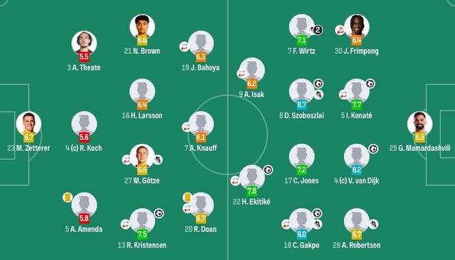 利物浦首发:25-马马尔达什维利、30-弗林蓬(19'12-布拉德利)、4-范戴克、5-科纳特(74'2-戈麦斯)、26-罗伯逊、7-维尔茨、8-索博斯洛伊、17-琼斯、9-伊萨克(46'14-基耶萨)、18-加克波(74'10-麦卡利斯特)、22-埃基蒂克(74'11-萨拉赫)