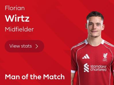 打入一球,维尔茨当选富勒姆vs利物浦全场最佳球员