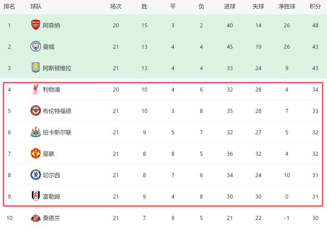 由于本轮切尔西在客场1-2输给富勒姆,曼联在积分榜上反超对手,但是他们的排名却被纽卡斯尔和布伦特福德反超。其中布伦特福德主场3-0大胜桑德兰,排名已经升上第5,落后第四的利物浦1分,他们已经成为名副其实的争四大黑马,而纽卡斯尔在主场4-3绝杀利兹联之后,也反超曼联和切尔西,目前排名第6。