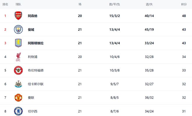 在积分榜上,曼联和阿斯顿维拉纷纷丢分,让阿森纳赚大了。阿森纳总积分是48分。曼城和阿斯顿维拉都是43分。阿森纳领先5分,而且还是少赛一场。如果阿森纳接下来能够击败利物浦,将把优势扩大到8分。利物浦目前34分,排名第4。布伦特福德以33分排名第5。纽卡斯尔联和曼联都是32分。