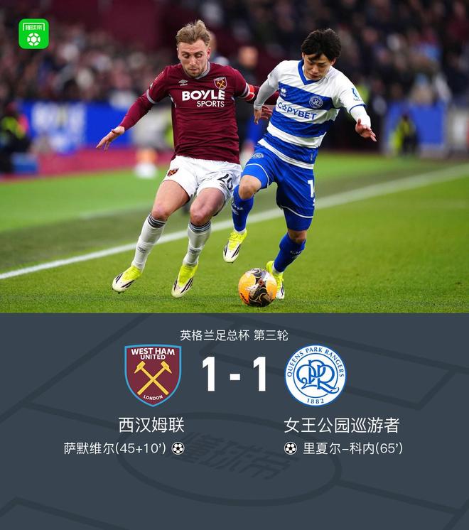 北京时间1月11日,英格兰足总杯第三轮展开较量,西汉姆联迎战女王公园巡游者。上半场补时阶段,马加萨送出助攻,萨默维尔抓住机会率先破门,为球队取得领先。易边再战,卡拉莫科-登贝莱成功策动进攻,里夏尔-科内完成破门,帮助球队扳平比分。最终双方以1比1握手言和,进入后续赛程。