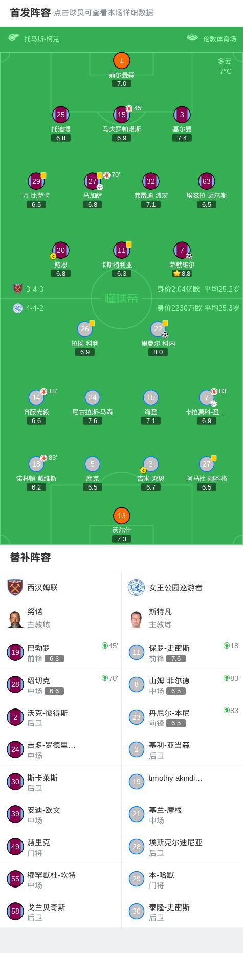 90分钟战报:西汉姆联11女王公园巡游者,萨默维尔、科内破门