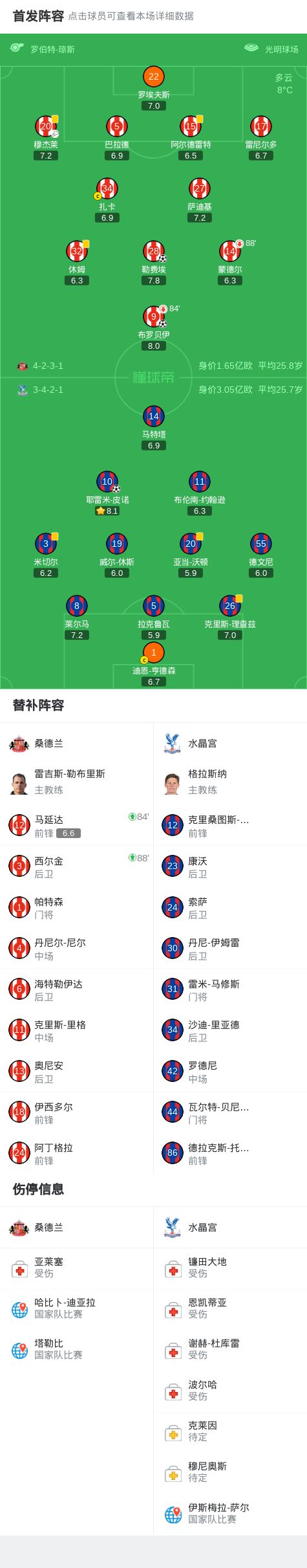 桑德兰21水晶宫,勒费埃建功,布罗贝伊制胜