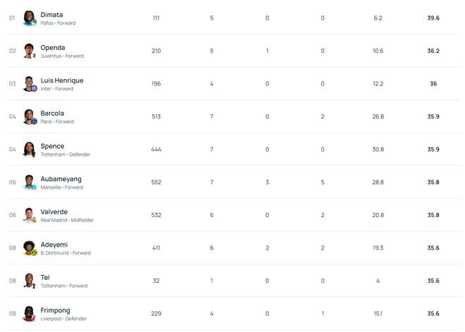 39.6kmh,帕福斯前锋迪马塔断层领先欧冠冲刺速度排行榜